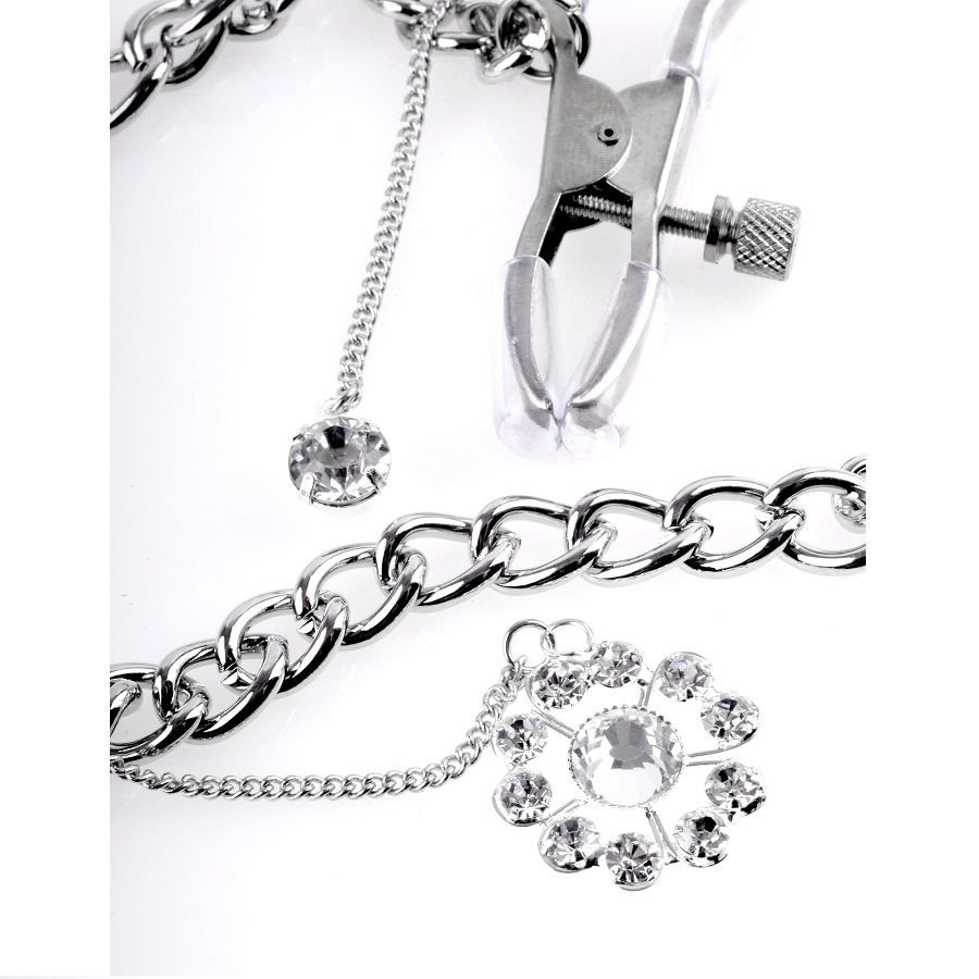 La quantité de pression que vous appliquez sur le mamelon est réglable en tournant la vis, tandis que les cristaux suspendus ajoutent une touche d'élégance et de style !